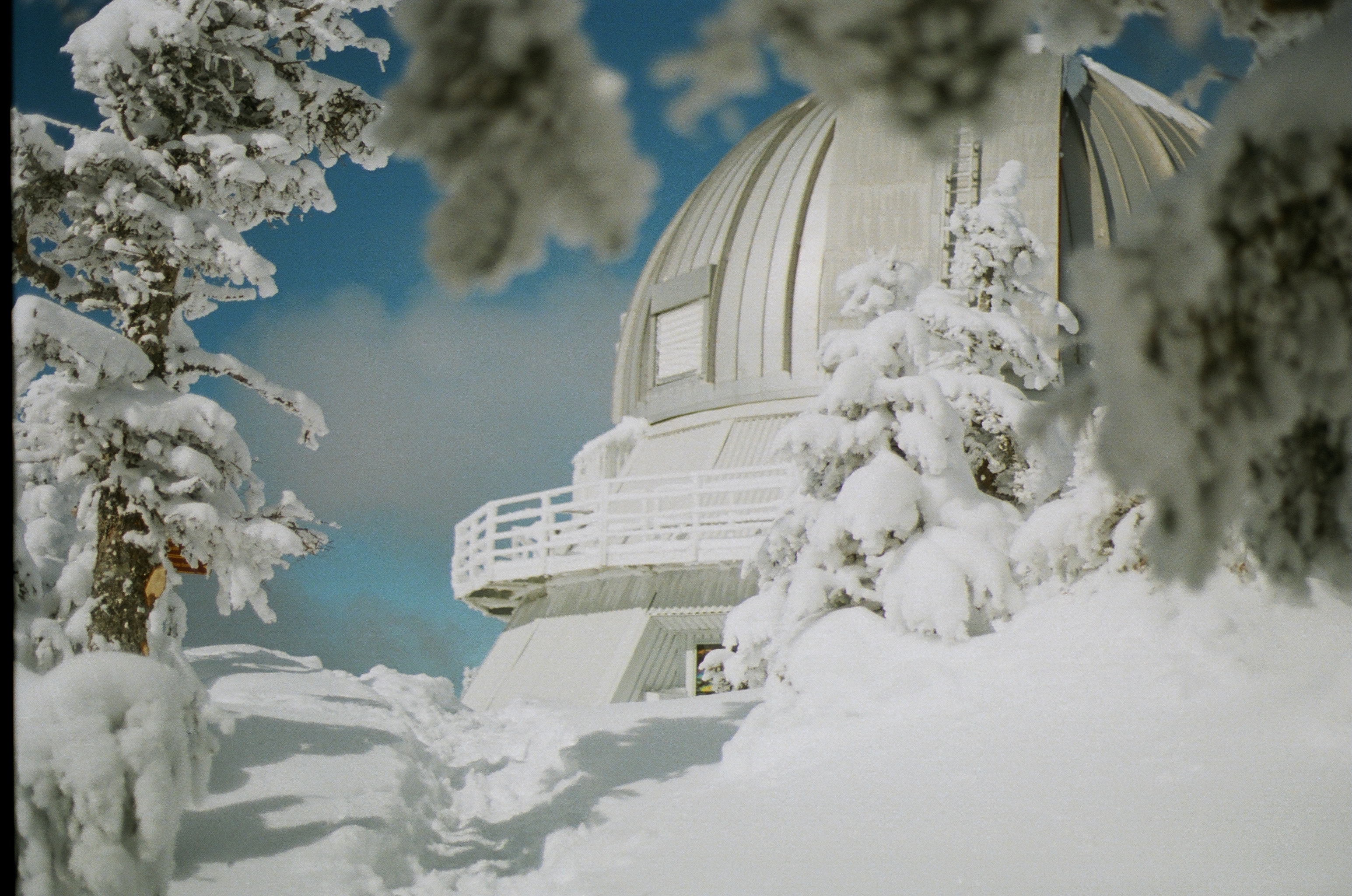 La forêt se découvre enfin pour faire apparaitre l’observatoire astronomique du mont Mégantic. Cet immense télescope marque le sommet du Mont Mégantic. On se croirait directement sorti d’un film de science-fiction. La neige est abondante au sommet.