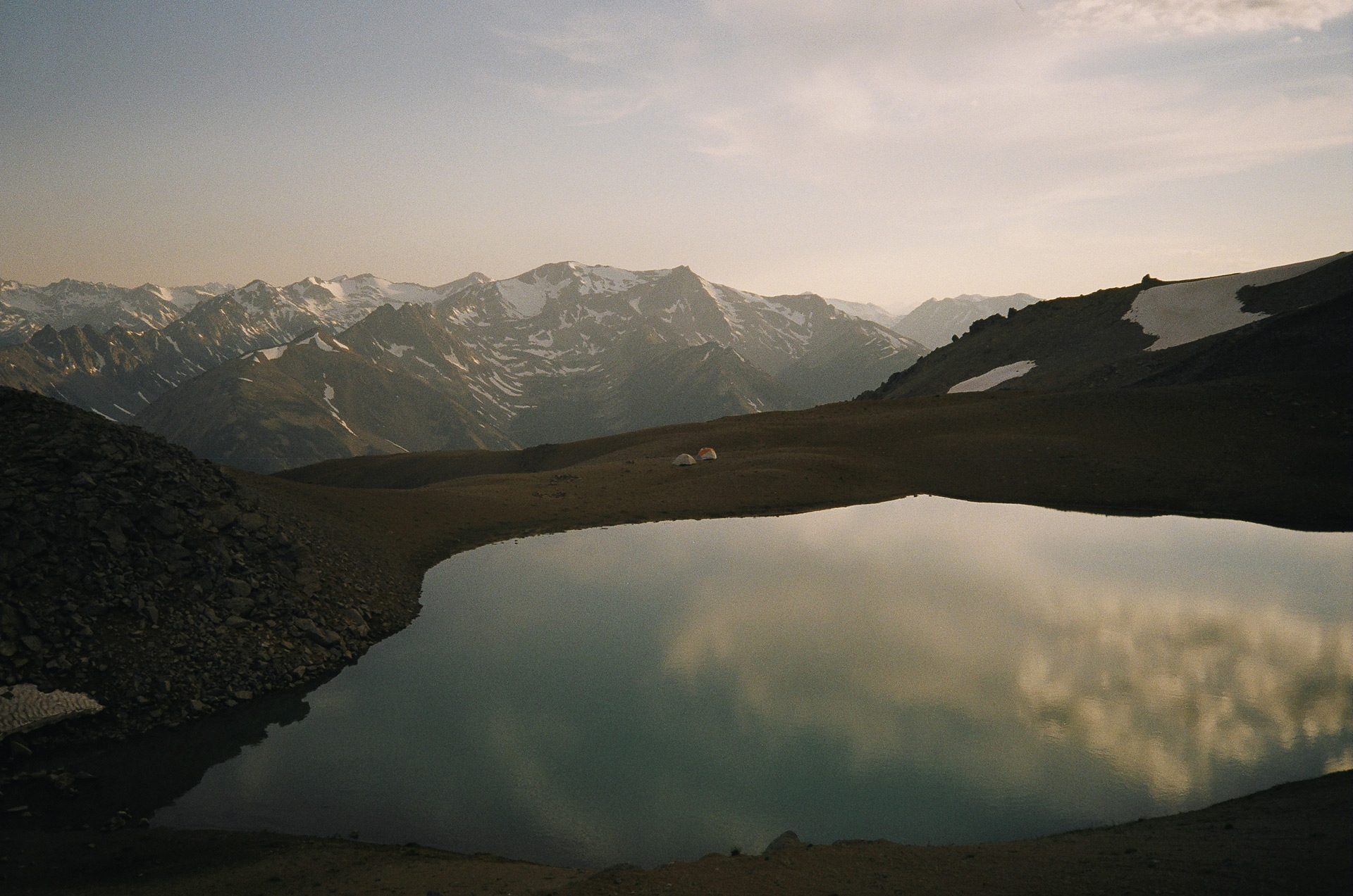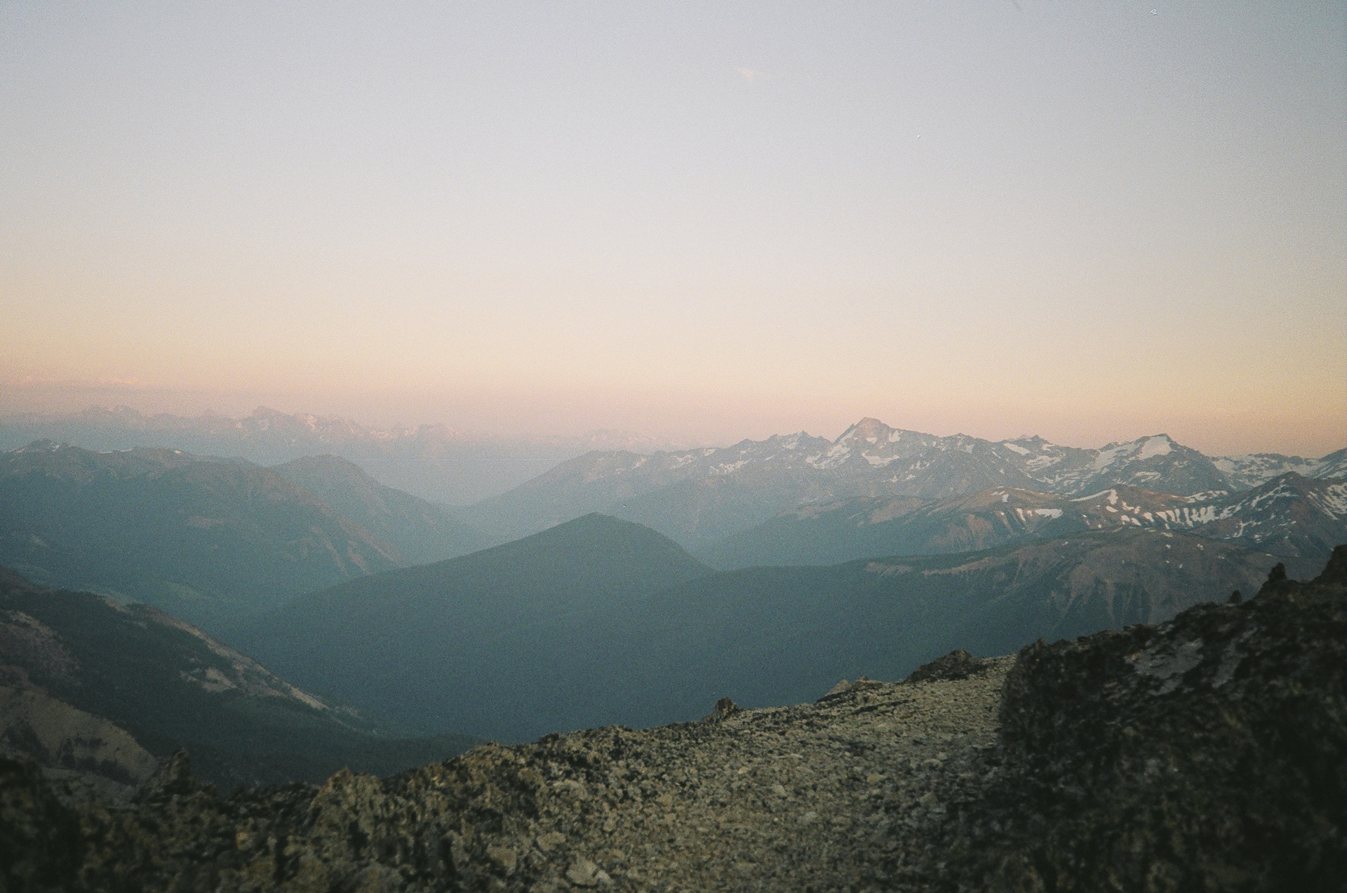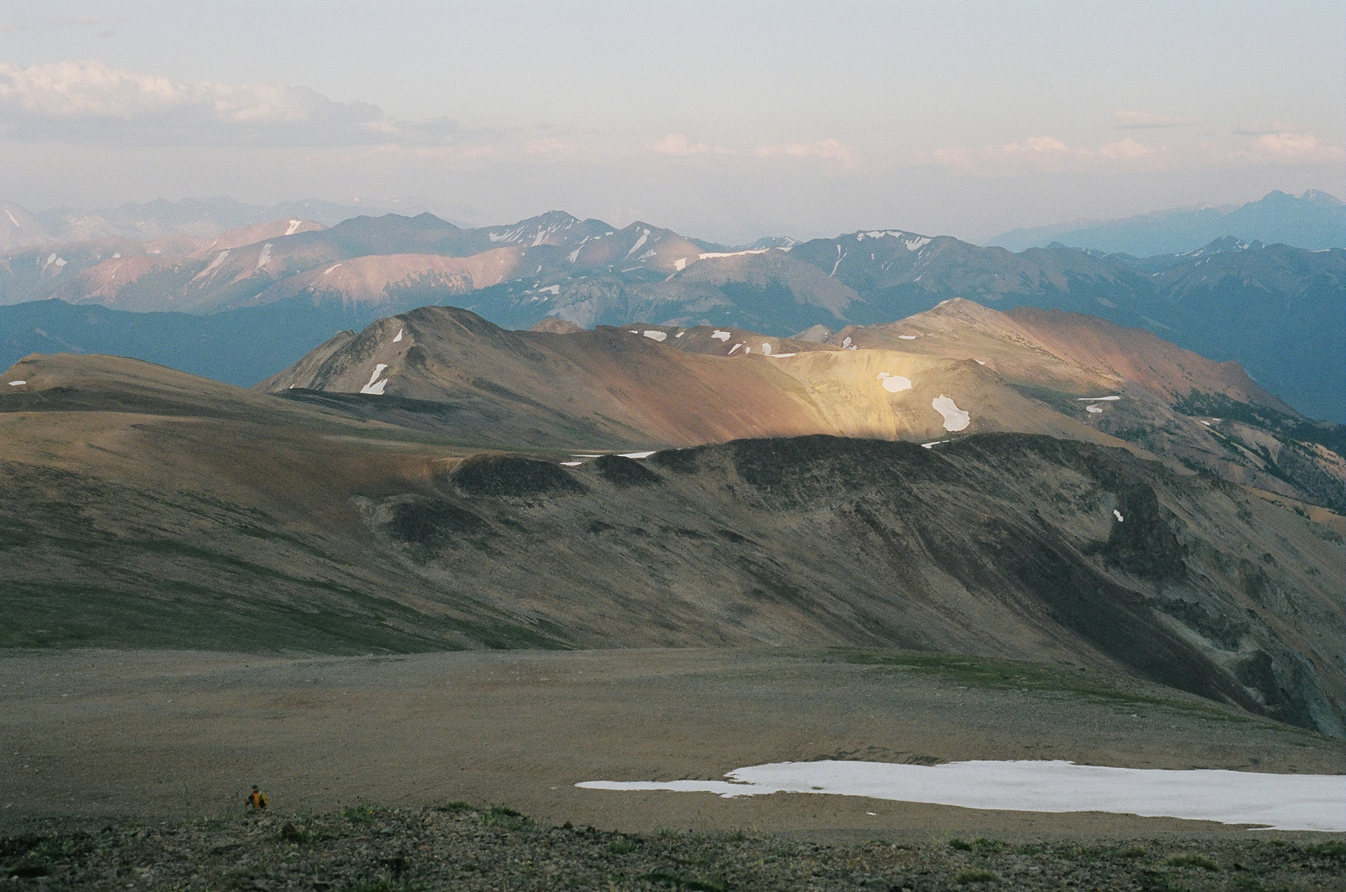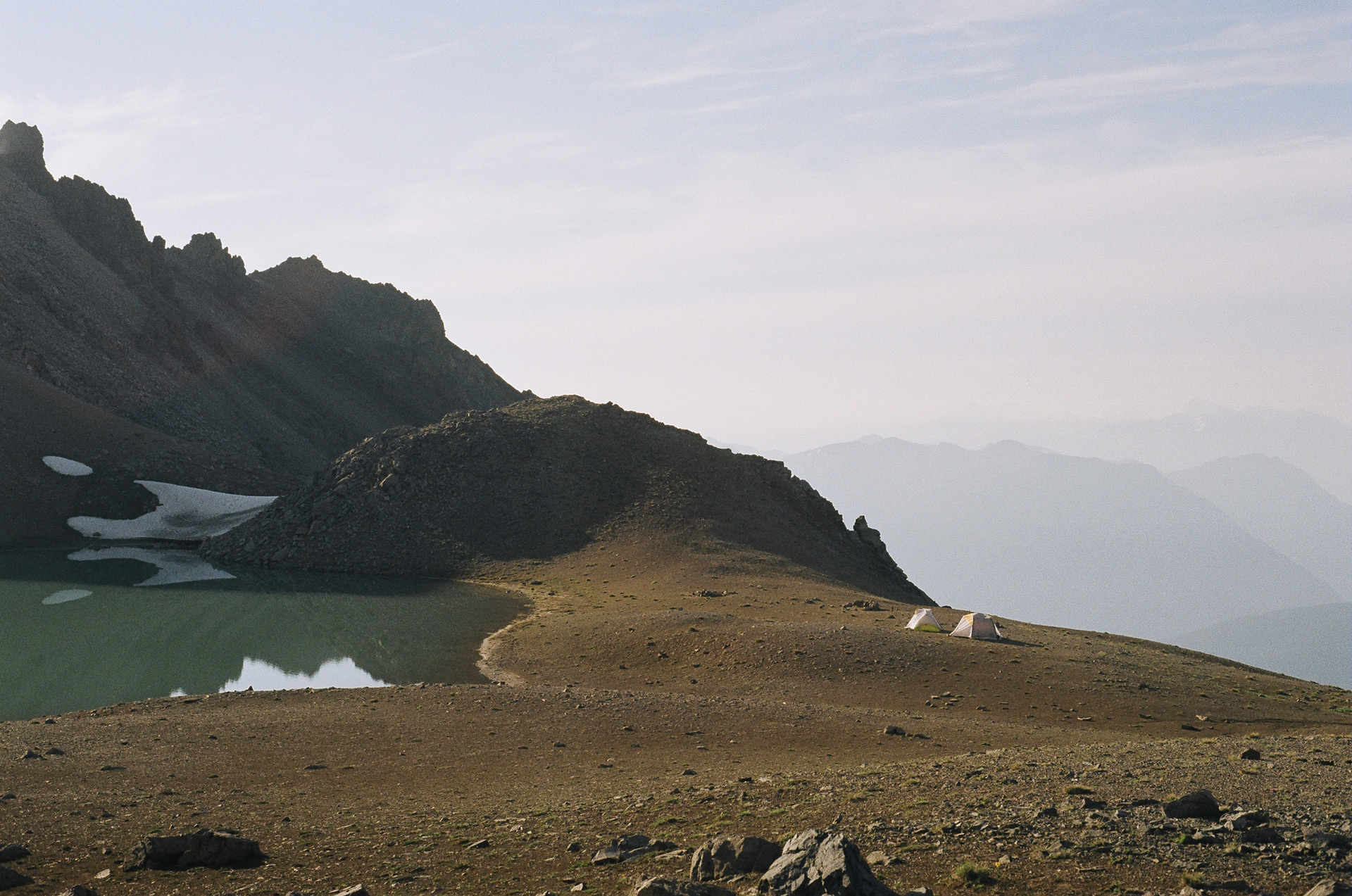Exténué, on se jette dans le lac. 10s plus tard, on resurgit hors de cette eau si froide. Un peu traumatisé par les efforts fournis lors de cette journée de seulement 8km, mais heureux d’être ici, perdu dans ces montagnes aux panoramas infinis. On monte le campement et après une petite sieste bien méritée et le diner, on prend le sentier qui nous amène au Mont Sheba (2550+ m) point culminant des South Chilcotin. La montée est difficile, escaladant entre les roches et la neige. On est bien content d’avoir laissé nos gros sacs à dos au campement. Finalement, on arrive à se poser sur un des sommets, offrant une vue spectaculaire sur les montagnes, avec un soleil couchant magnifique. À couper le souffle. Les montagnes s’étendent sur des kilomètres à la ronde. On se sent vraiment loin de notre vie de tous les jours. Complètement déconnecté, dans ce silence difficile à trouver ailleurs.