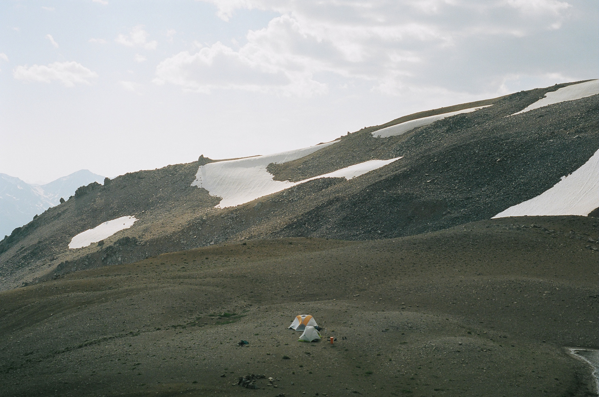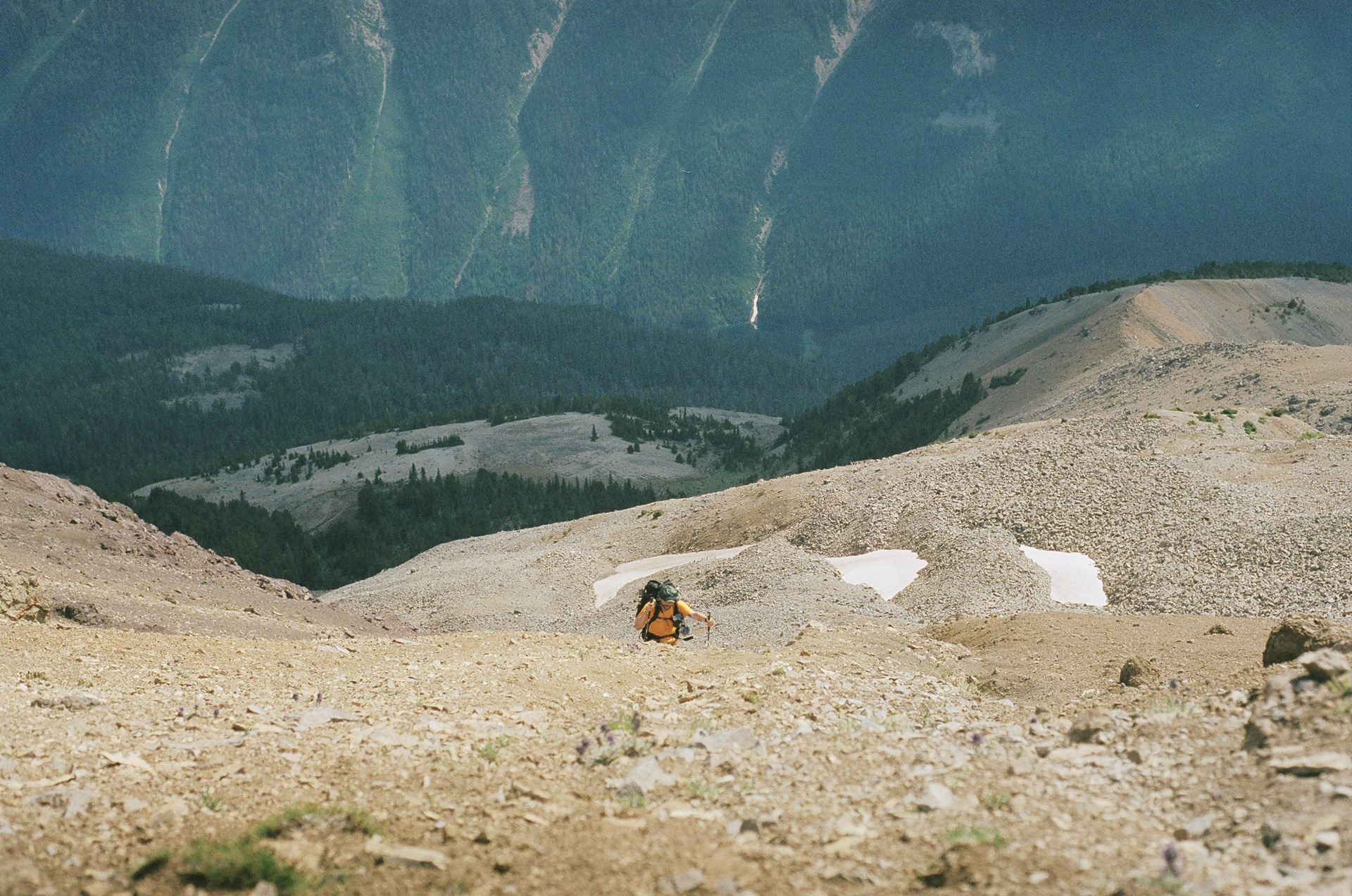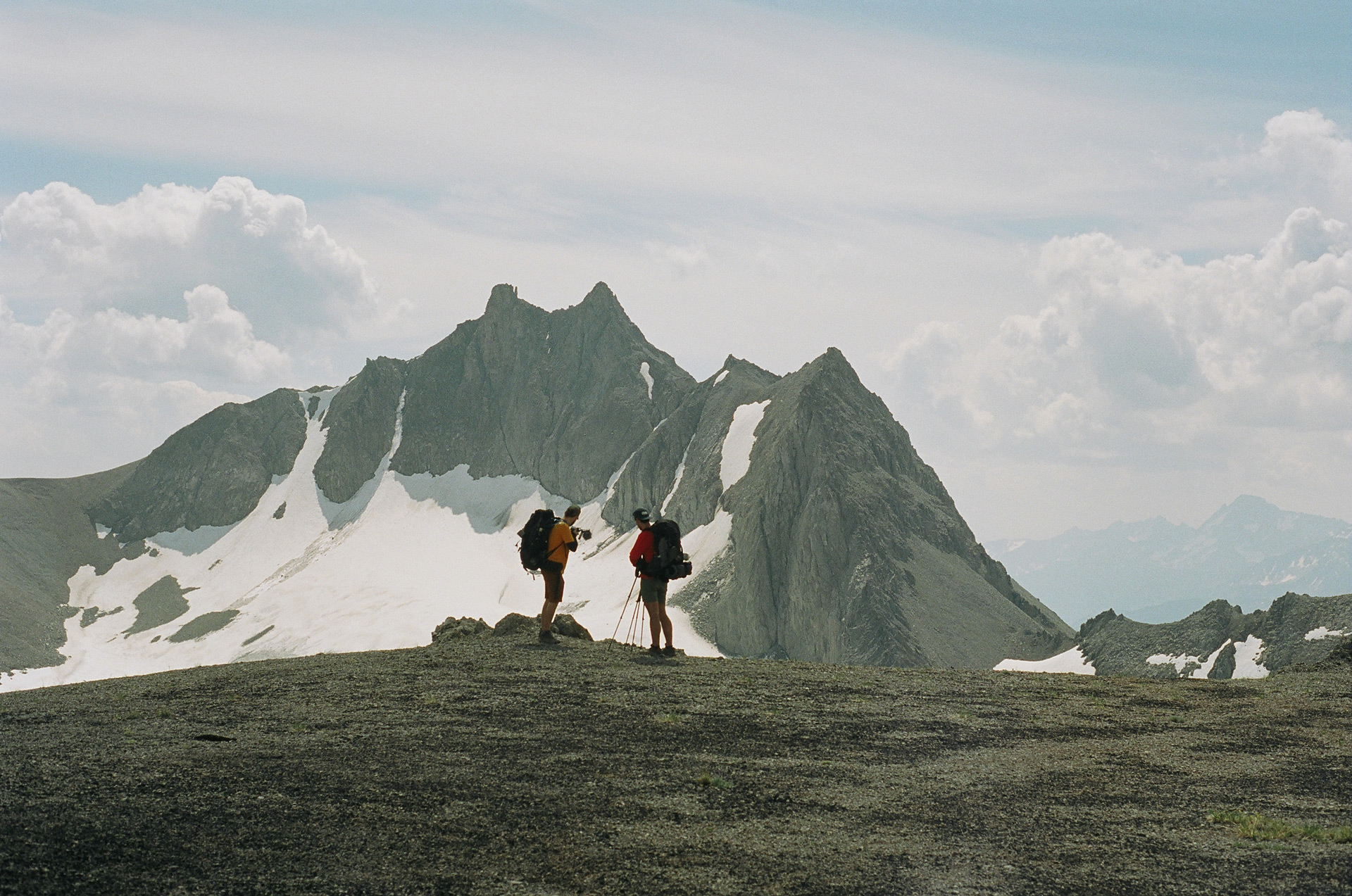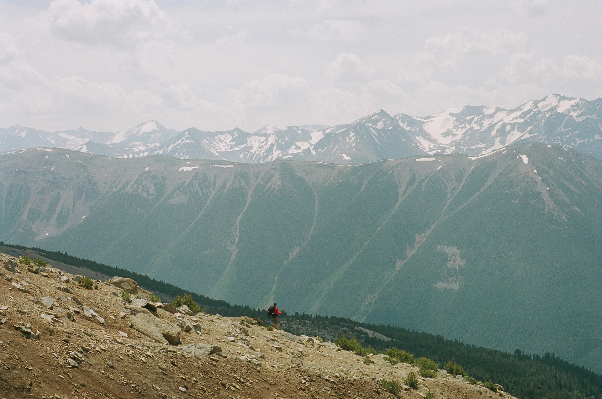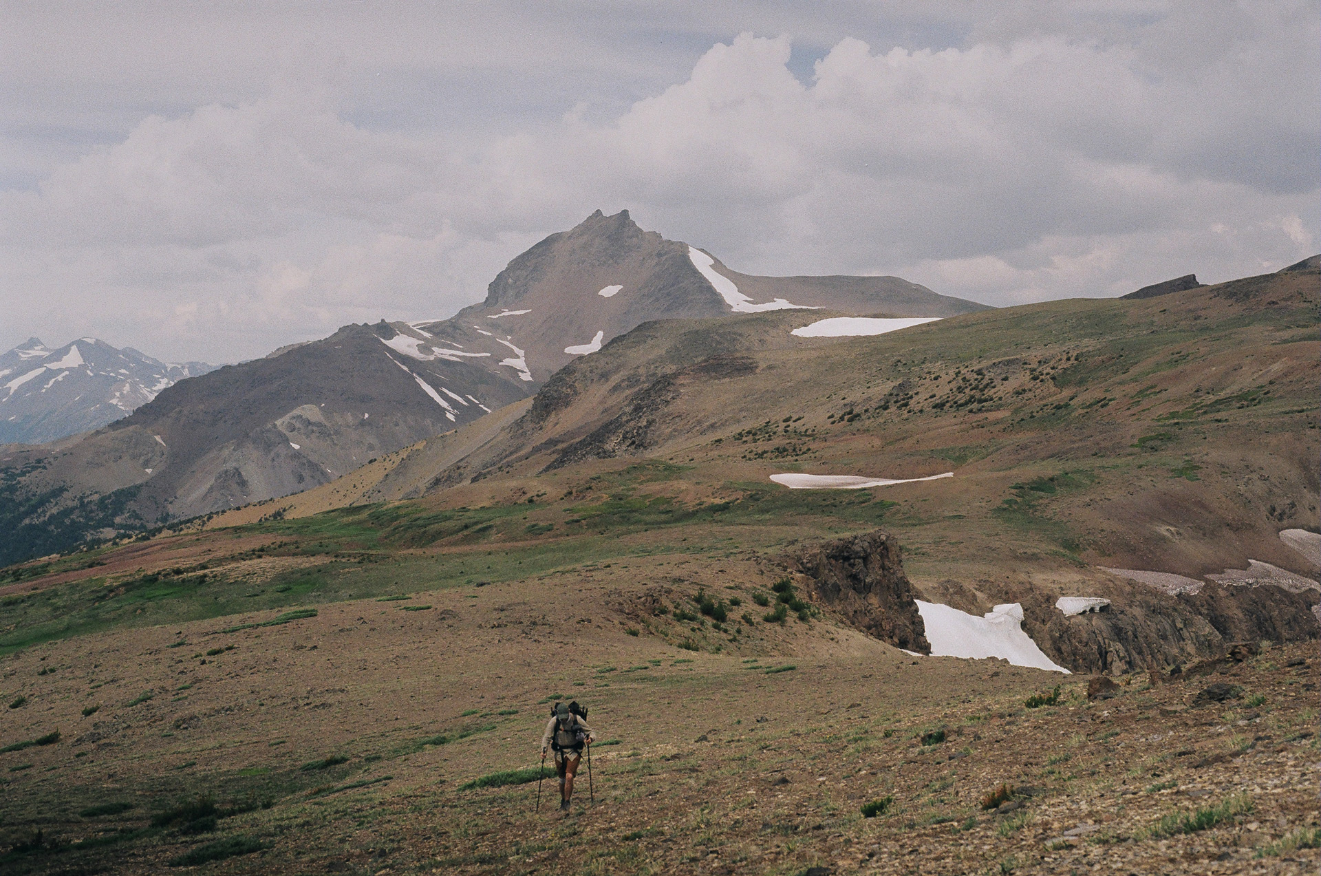Exténué, on se jette dans le lac. 10s plus tard, on resurgit hors de cette eau si froide. Un peu traumatisé par les efforts fournis lors de cette journée de seulement 8km, mais heureux d’être ici, perdu dans ces montagnes aux panoramas infinis. On monte le campement et après une petite sieste bien méritée et le diner, on prend le sentier qui nous amène au Mont Sheba (2550+ m) point culminant des South Chilcotin. La montée est difficile, escaladant entre les roches et la neige. On est bien content d’avoir laissé nos gros sacs à dos au campement. Finalement, on arrive à se poser sur un des sommets, offrant une vue spectaculaire sur les montagnes, avec un soleil couchant magnifique. À couper le souffle. Les montagnes s’étendent sur des kilomètres à la ronde. On se sent vraiment loin de notre vie de tous les jours. Complètement déconnecté, dans ce silence difficile à trouver ailleurs.