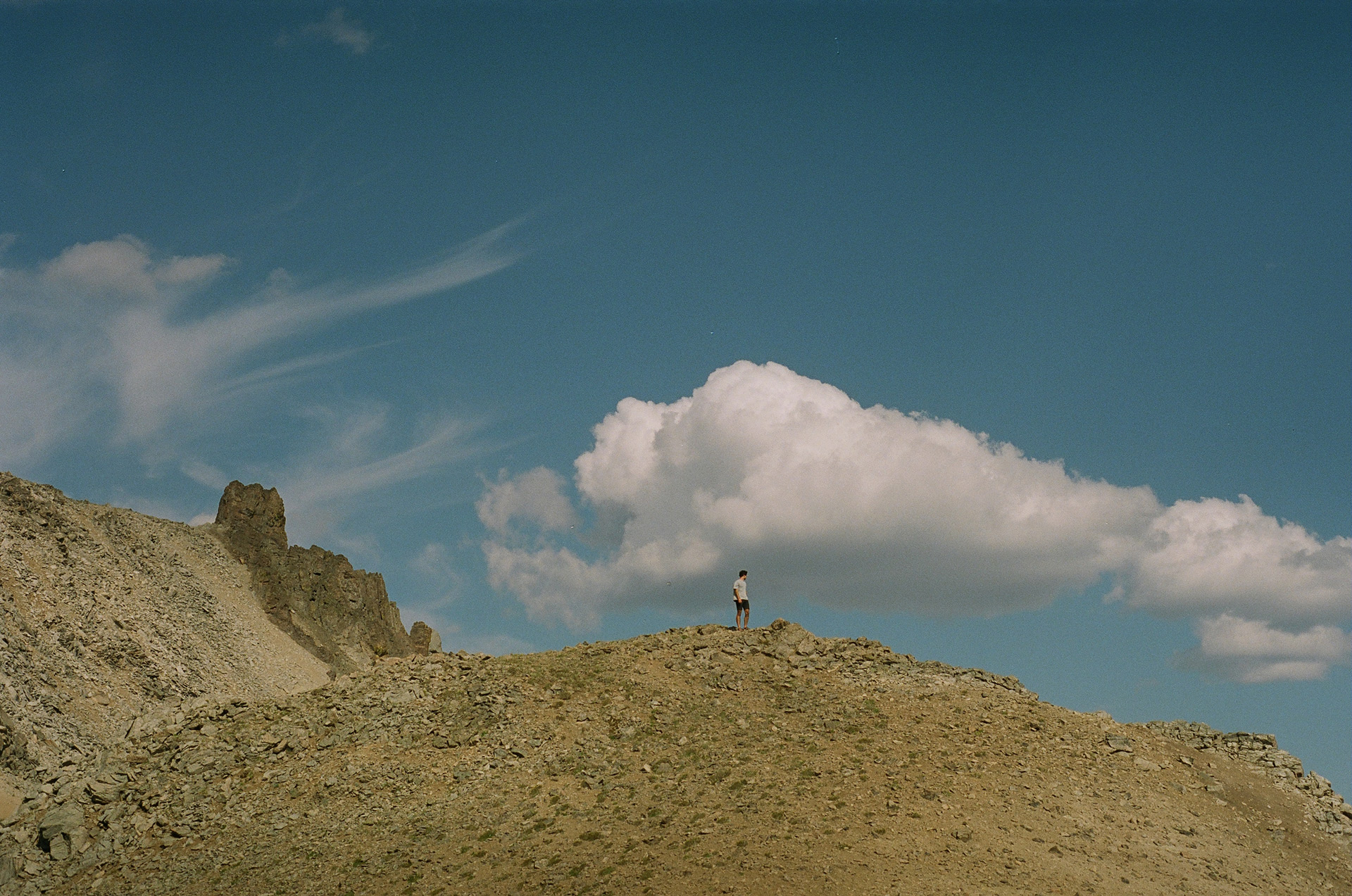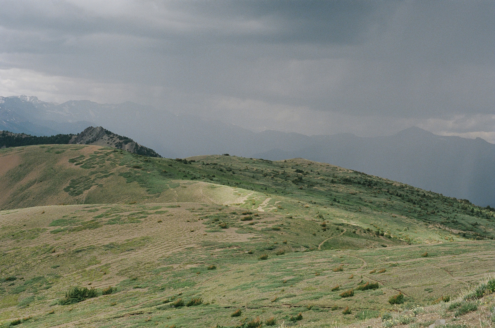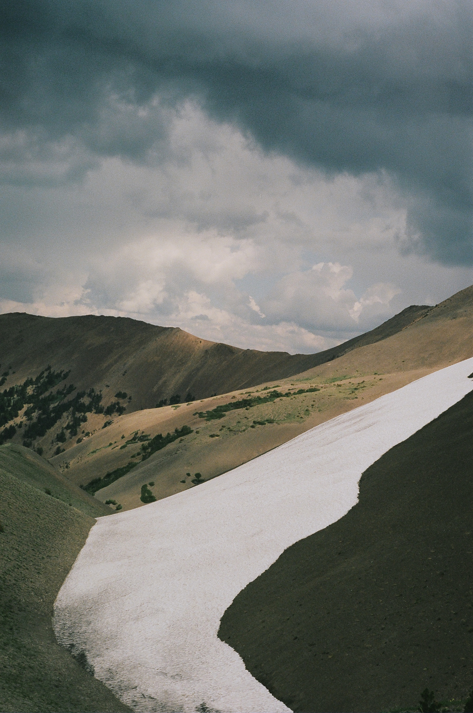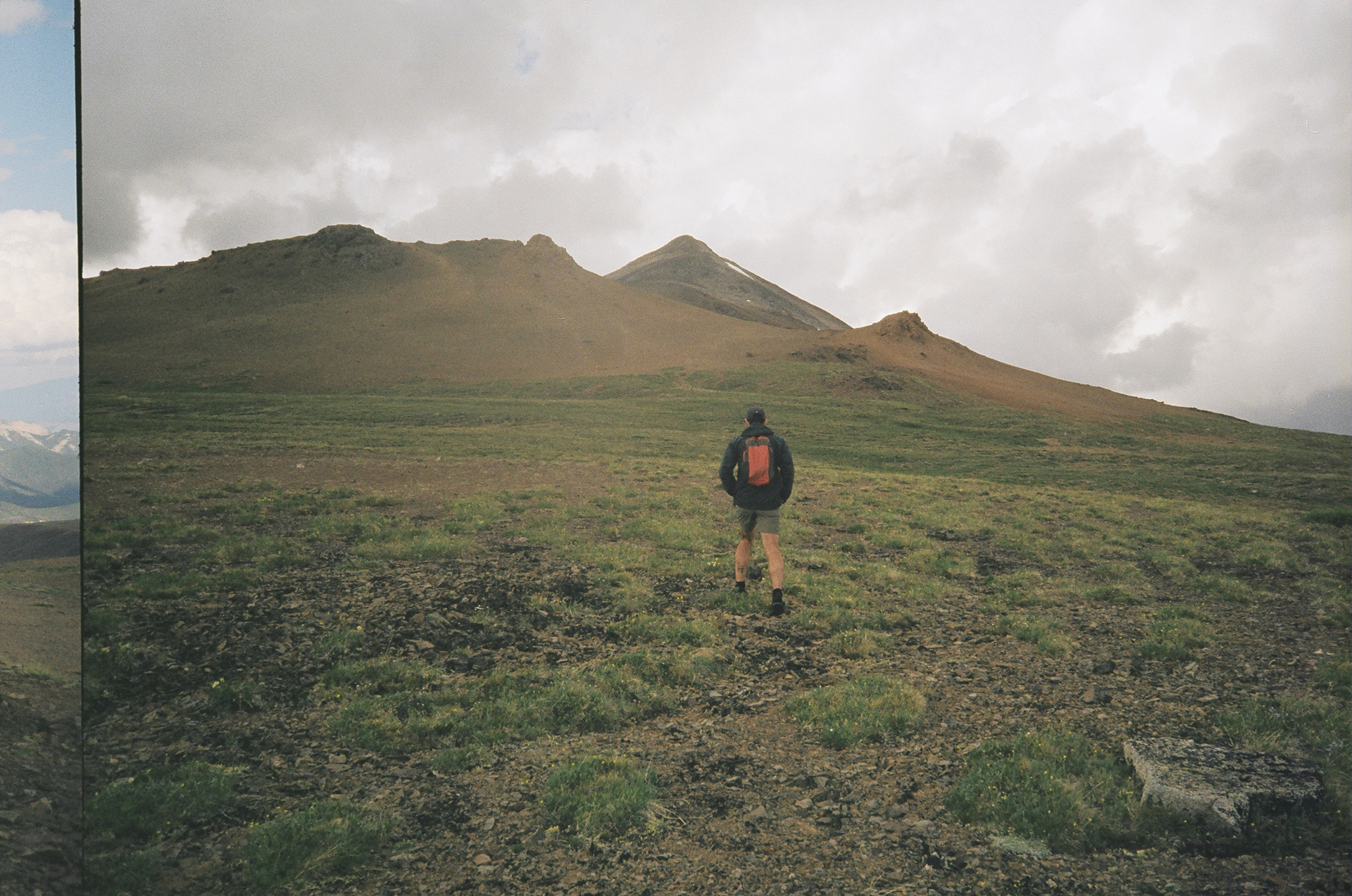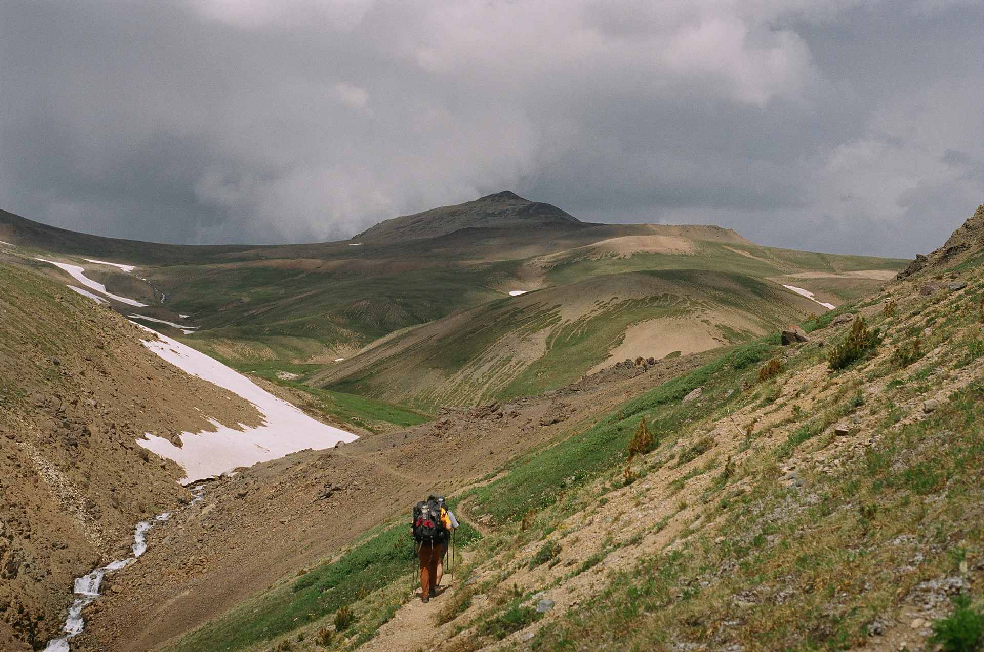 11km plus tard, on arrive en haut du Deer Pass, dans un plateau alpin magnifique. Le temps est un mélange de soleil et de nuages. On monte nos tentes à côté d’un petit lac. Cette zone était totalement exposée aux éléments. On se trouvait à un peu plus de 2000m, entouré dans toutes les directions par des montagnes beiges et désertiques. Après avoir repris nos forces, on décide d’aller monter sur une petite montagne qui surplombe notre campement. Le mont Salomon d’après notre carte. 1h de scrambling mais la vue au sommet vaut le 2km. Une vue imprenable sur toute la chaîne de montagnes aux alentours, et ses nombreuses vallées. Les montagnes de cette région sont très arrondies et colorées dans des tons de brun, de cannelle et de mauve. On s’aperçoit finalement qu’on est encore bien loin du Mont Salomon. N’étant pas sur notre carte, on rebaptise la montagne, le mont Triple A, pour Alexis, Anthony et Alexis. La température est vraiment instable. Durant la soirée, on passe d’un grand soleil, à une fine pluie, à un déluge de grêle, à du tonnerre, et à nouveau un grand soleil… en seulement quelques heures.