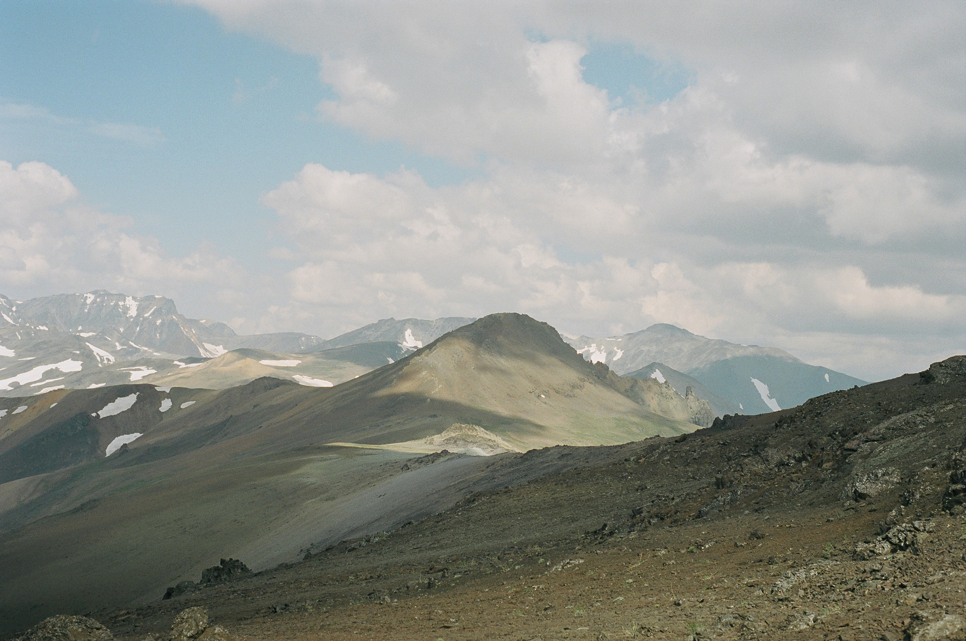 Départ pour le Mont Sheba. Le début de la journée est agréable, sous un beau soleil. On marche sur la crête des montagnes. On traverse de vastes étendues presque lunaires. Au bout de quelques kms, le sentier devient de moins en moins visible. On essaye de trouver des traces de pas, mais rapidement on doit seulement se repérer avec notre carte. On voit un petit lac au loin en contrebas de la montagne. Notre campement du soir se trouve proche d’un lac et il n’y en a pas d’autres sur la carte dans les alentours. Le dénivelé de la carte ne correspond pas avec notre position, ni même la direction. Il doit y avoir une erreur. Après de longues réflexions avec les gars, on décide de rejoindre ce lac. Après avoir descendu à travers les buissons, arbres et roches, on arrive enfin au « lac ». Ou plutôt, à l’étang. En effet, une fois sur place, ce qui nous paraissait un grand lac de loin n’est en réalité qu’un minuscule étang. Désespéré, et trop fatigué pour remonter en arrière, on décide de continuer en suivant la carte, et remonter par le flanc d’une autre montagne. Alexis sort le drone pour aller explorer les alentours. Pas de lac. Fatigué, stressé, on essaye de traverser un éboulis pour arriver de l’autre côté de la montagne. Les roches anguleuses s’effritent à chaque pas. On s’aventure sur les cailloux très lentement, pour éviter un glissement de terrain qui nous entraînerait dans le bas de la montagne.